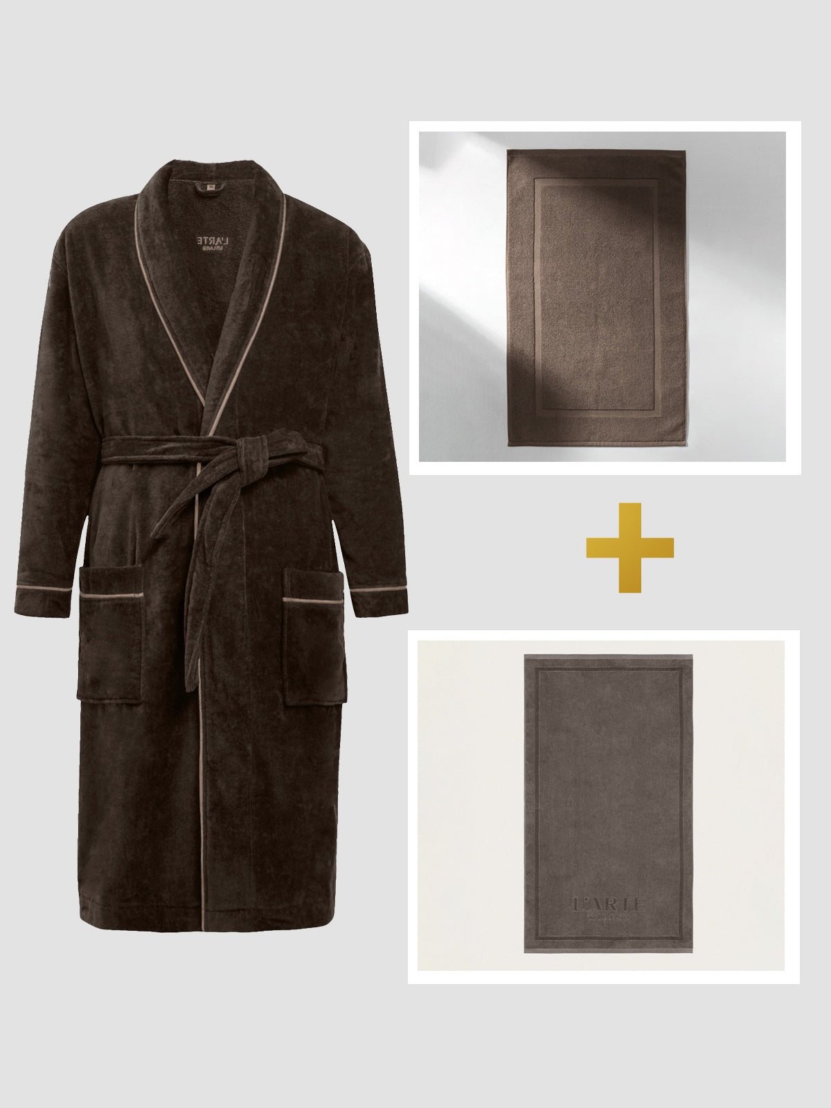 Rinkinys: chalatas, vonios kilimelis, 50x85 cm ir didelis veliūrinis rankšluostis – 90 x 170 cm