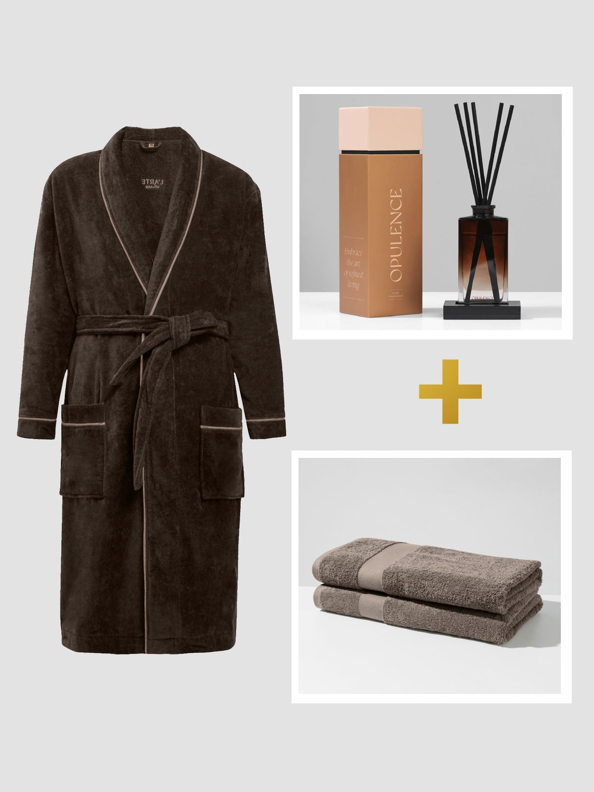 Rinkinys: chalatas, namų kvapas "Opulence", 120 ml ir medvilnės rankšluosčių rinkinys – (2 vnt, 70 x 140 cm)